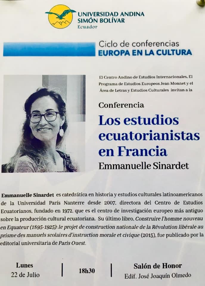 Le Centre d'études équatoriennes, groupe du Centre de recherches ibériques et ibéro-américaines (CRIIA - EA Etudes Romanes) de l'Université Paris Nanterre, organise une conférence sur " Les études équatoriennes en France " à l’Université Andine Simon Bolivar en Equateur
