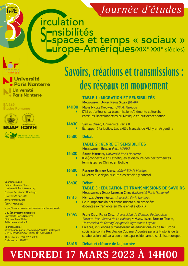 Le Réseau international de recherche "Connexion(s)" organise sa première journée d'études le 17 mars 2023 (Paris, 14h-19h/Mexico 7h00-12h00/La Havane 8h00-13h00), en salle de séminaire 2 du bâtiment Max Weber à l'Université Paris Nanterre.