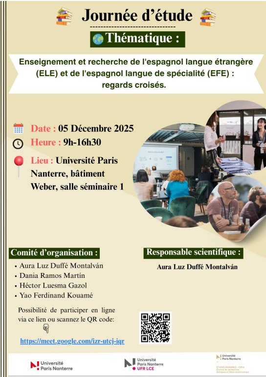 Au cours de cette journée d'études, nous proposons de faire le point sur la recherche et l'enseignement de l'espagnol comme langue étrangère (ELE) et de l'espagnol à des fins spécifiques (EFE). Pour cela, nous avons invité aussi bien de jeunes chercheurs que des experts en la matière afin qu'ils puissent présenter leurs travaux dans ces domaines.